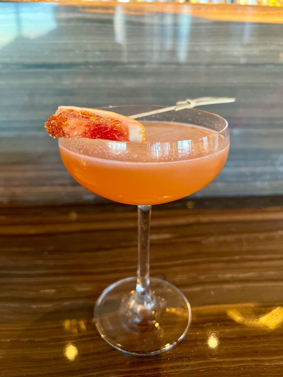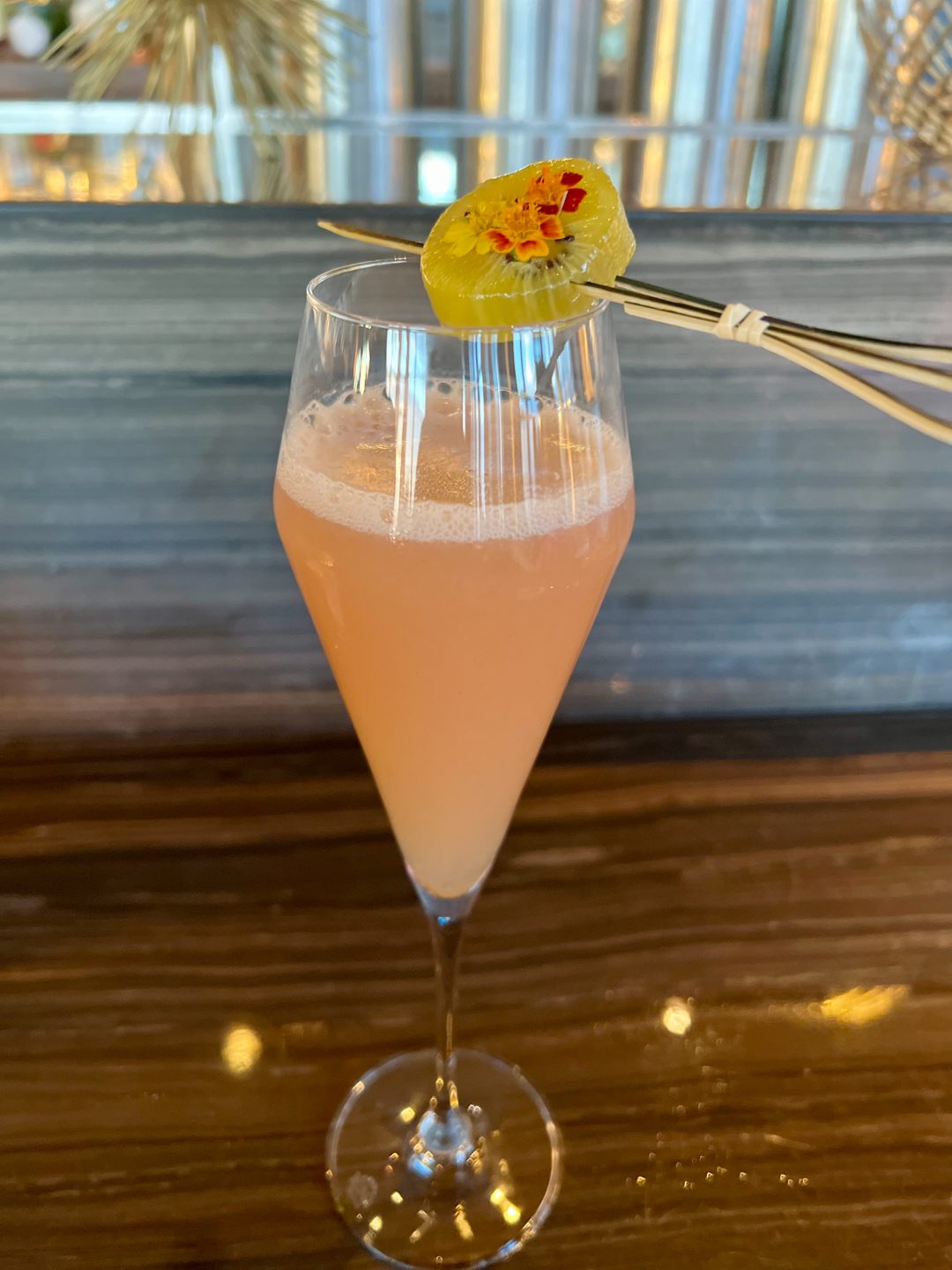 Next up, the Golden Hour. This drink is a real game changer, made with Tequila Ocho Plata, Vago Elote, Walnut Liqueur, lemon, lime, guava, kiwi, orgeat, and topped off with some sparkling. The smooth tequila is elevated by the unique flavors of Vago Elote and Walnut Liqueur, while the tropical vibe from guava, kiwi, and orgeat will have you feeling like you’re on a beach. The perfect balance of sweet and sour from the lemon and lime, combined with the sparkling, makes this drink a must-try.