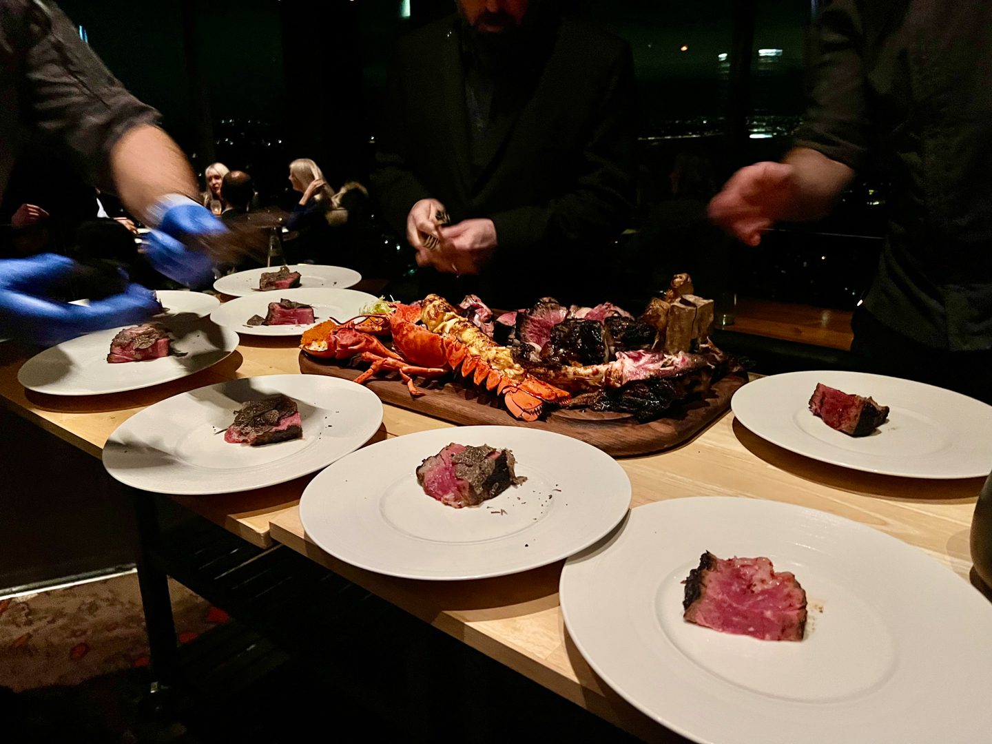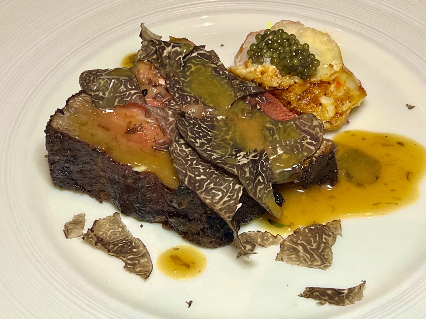And last but not least, the main event! The American wagyu Mishima ultra triple chop is next level. It’s been miso cured for 4 hours to intensify the umami of the wagyu beef and then seasoned with a special Ascend cowboy rub with many spices. The steak is marked on the grill, baked with whipped gochujang butter, and seared to perfection. The lobster roulade, stuffed with scallop and citrus mousse, is finished with butter basting and a sea urchin aioli. And to top it off, the dish is garnished with shoyu truffle beurre blanc, fresh shaved truffles, and osetra caviar.