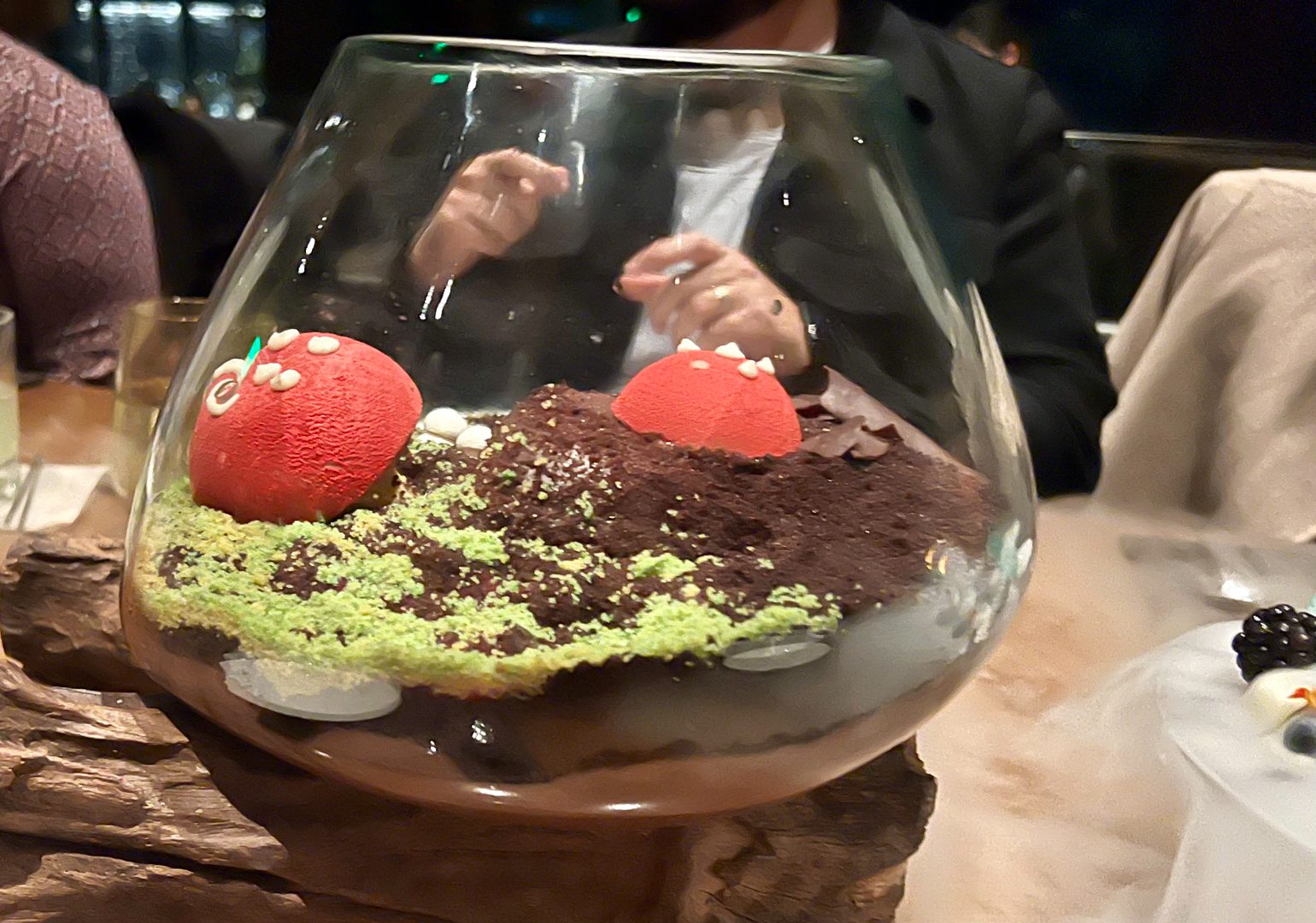 These delectable desserts offer a unique blend of flavors and textures, sure to satisfy any sweet tooth. For example, “Magic Mushroom” combines the rich taste of white chocolate cherry mousse with the earthy undertones of matcha shortbread. And if you have anything to celebrate, the “Skyfall” dry ice presentation is a show stopper! It brings together the bold flavor of miso chocolate caramel with the light, airy texture of goat cheese panna cotta.