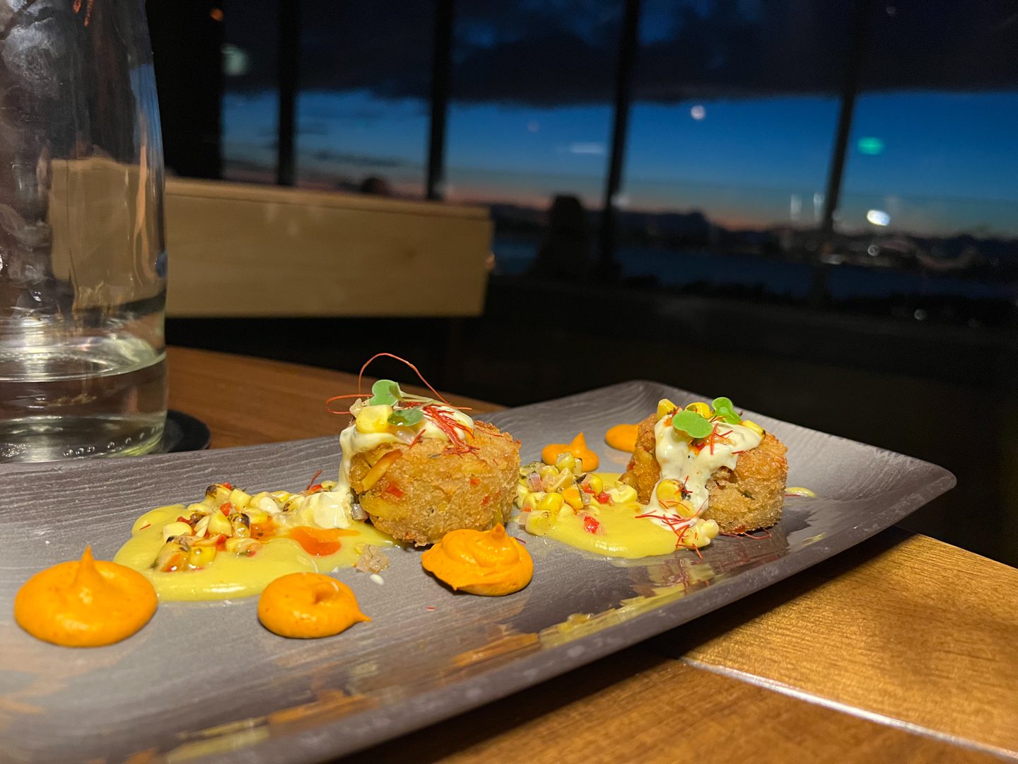Now, let’s talk about the food. If you’re looking for a vegan twist on traditional crab cakes, the jackfruit “krab” cakes are the way to go. Made with young green jackfruit, these cakes have a meaty texture that mimics crab meat and are paired with a creamy corn pudding, spicy carrot romesco, tangy meyer lemon tofu tarutaru sauce, and fresh fresno chile corn relish.